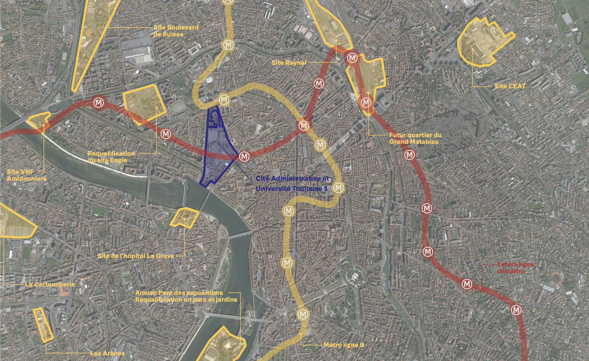 Le site de la Cité Administrative de Toulouse est un territoire interface entre plusieurs fragments urbains, localisé le long d’un boulevard structurant de la ville, au droit d’une station de métro et constitue une véritable entrée urbaine vers l’hyper-centre de Toulouse et la Ville-Centre du Fleuve.