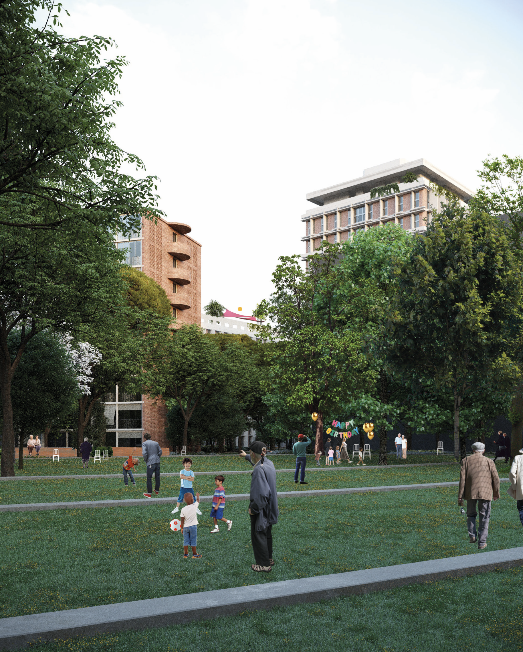 Les emprises bâties condensées le long de la rue Lascrosses permettent de ménager un large espace public paysager en pleine terre. De même manière, les places de stationnement sont superposées aux emprises bâties pour ne pas limiter la richesse végétale de ce nouveau parc urbain. Le parc est dimensionné à la mesure du quartier habitant et devient la condition d’un cadre de vie agréable face aux changements climatiques à venir.