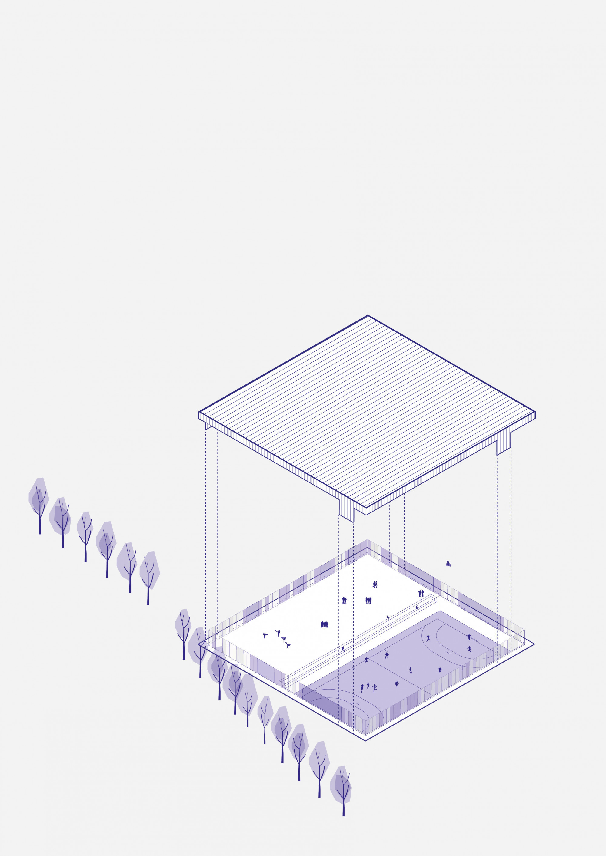 Sous une même structure, deux grandes entités : une cuve avec les terrains principaux et un vide réceptacle. Ce vide est un espace neutre rempli d'histoires possibles. La décision radicale de la toiture et de ses grands franchissements dégage ces opportunités. Les usagers pourront reprogrammer le bâtiment au besoin.